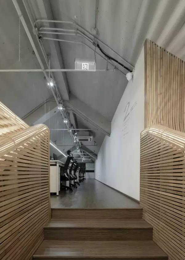 高端文化傳媒辦公室設計:將竹子的元素運用在這里,并還原其本身的色彩。藝術必須出自于大自然,因為大自然已為人們創造出較獨特美麗的造型。而竹子作為一種建筑材料代表了古代亞洲建筑體系的內涵, 而中國它的產量是足夠支撐裝飾材料的消耗的,并且有著高韌性、可塑性強的特點。在連接頂層的樓梯部分,我們沒有再讓竹子繼續沿用直線語素。頂面部分做曲線拼接,延續而上。