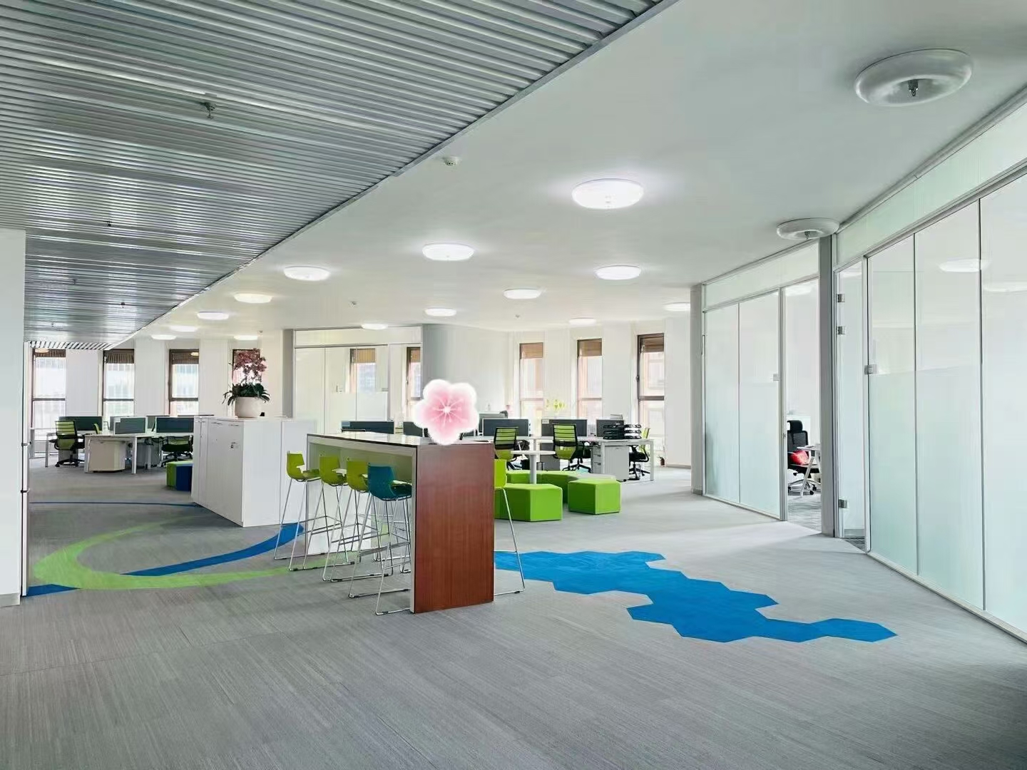 3、某公司前廳區右側,是直通二樓的木飾面步梯,臺階加寬,高度錯落有致,LOGO藍,粉,灰與原木色相間,這不僅僅是上下樓梯,更承載著員工的休憩與溝通交流功能,因此增強該區域的趣味性。步梯后方和右側辦公室吧臺巧妙的設計成一個連貫性的茶水區,吧臺錯落在茶水柜延伸出的區域,搭配綠植,增添生機和活力。