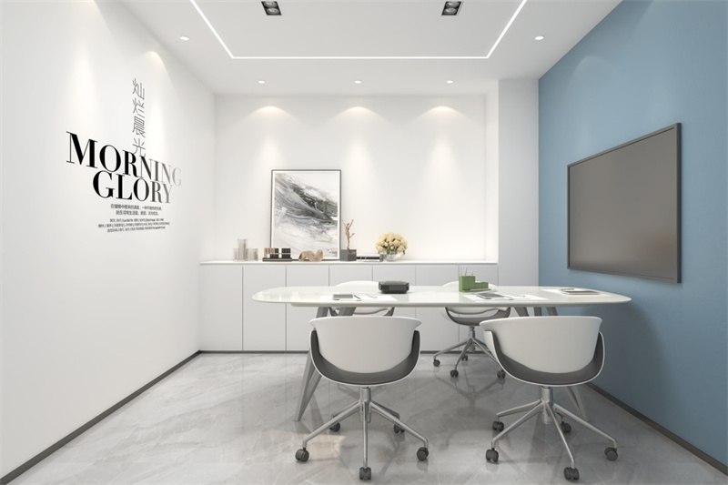 墻面單層涂料:墻面涂料大多是指乳膠漆,在辦公室裝修中是使用最廣的一種,其施工簡單、易于調色、造價便宜,能夠使辦公室產生整體感,且突出空間明亮、寬敞,是被大眾廣泛接受且使用的辦公室裝修設計材料。但因為其裝飾性較低、變化不多的局限性,所以在進行辦公室裝修時,可以選擇在墻面上做一些掛畫裝飾,并配以射燈。墻面素雅、燈光點綴,在光線映照的柔和陰影里,可以提升辦公室的簡約舒適感。